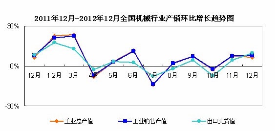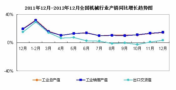 統計數據顯示,2012年1-12月,全國機械工業經濟運行速度同比持續呈現回升的態勢。12月份,工業總產值的累計同比增速為14.24%;工業銷售產值的累計同比增速為14.64%,出口交貨值的累計同比增速為3.26%。